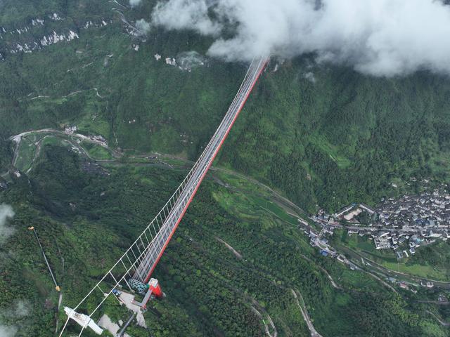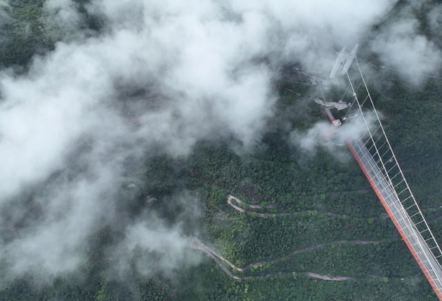 7月8日,雨过天晴后的湖南省湘西土家族苗族自治州吉首市矮寨特大悬索桥和矮寨盘山公路云雾缭绕,景色秀美。