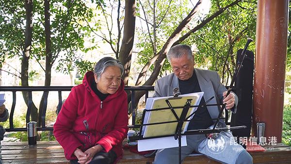 In a pavilion of Yuquanhu subdistrict, Huang Xingbang was playing erhu, and several old people with grey hair were laughing and singing with the melody, which was very lively.