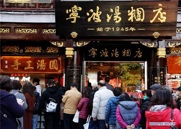 People queue up to buy sweet dumplings, a kind of glutinous rice-made puddings stuffed with fillings of various flavours, at a restaurant at Yuyuan Garden in Shanghai, east China, Feb. 24, 2021. The shop is busy making sweet dumplings ahead of the upcoming Chinese lantern festival. The quantity of the sweet dumplings been sold here has reached 70,000 daily. (Xinhua/Liu Ying)