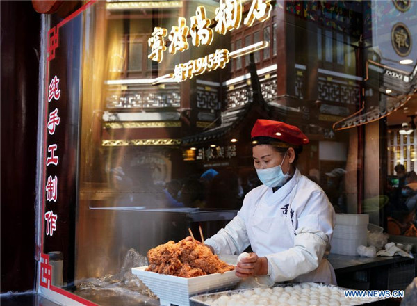 A worker sells sweet dumplings, a kind of glutinous rice-made puddings stuffed with fillings of various flavours, at a restaurant at Yuyuan Garden in Shanghai, east China, Feb. 24, 2021. The shop is busy making sweet dumplings ahead of the upcoming Chinese lantern festival. The quantity of the sweet dumplings been sold here has reached 70,000 daily. (Xinhua/Liu Ying)