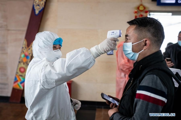A staff member checks the temperature of a man at the airport in Shangri-la of Diqing Tibetan Autonomous Prefecture, southwest China's Yunnan Province, March 17, 2020. Since the outbreak of COVID-19, local authorities in the poverty-stricken Diqing has taken great measures to ensure the safety of workers returning to work, including scanning OR codes for better health checks and disinfection at public areas. Up till now, Diqing has resumed production at a comprehensive level. (Xinhua/Hu Chao)
