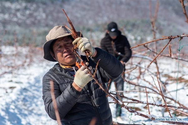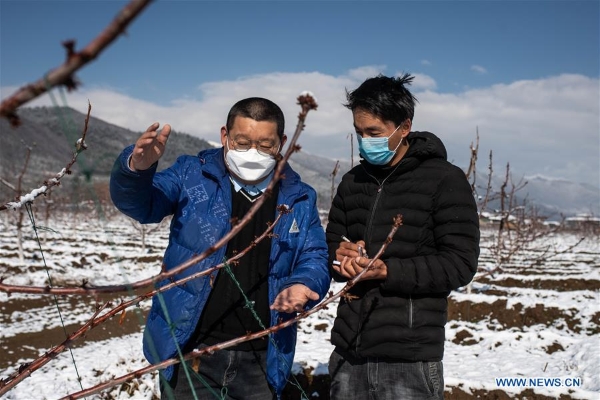 Workers trim cherry trees at a poverty alleviation demonstration park in Shangri-la of Diqing Tibetan Autonomous Prefecture, southwest China's Yunnan Province, March 17, 2020. Since the outbreak of COVID-19, local authorities in the poverty-stricken Diqing has taken great measures to ensure the safety of workers returning to work, including scanning OR codes for better health checks and disinfection at public areas. Up till now, Diqing has resumed production at a comprehensive level. (Xinhua/Hu Chao)