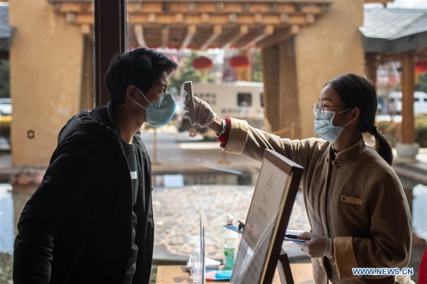A visitor has his temperature checked at a hotel in Shangri-la of Diqing Tibetan Autonomous Prefecture, southwest China's Yunnan Province, March 17, 2020. Since the outbreak of COVID-19, local authorities in the poverty-stricken Diqing has taken great measures to ensure the safety of workers returning to work, including scanning OR codes for better health checks and disinfection at public areas. Up till now, Diqing has resumed production at a comprehensive level. (Xinhua/Hu Chao)