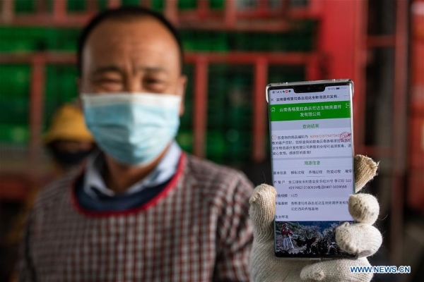 Villager Li Yinzhen displays online health information of his poultry at the Shangri-la e-commerce service center in Shangri-la of Diqing Tibetan Autonomous Prefecture, southwest China's Yunnan Province, March 17, 2020. Since the outbreak of COVID-19, local authorities in the poverty-stricken Diqing has taken great measures to ensure the safety of workers returning to work, including scanning OR codes for better health checks and disinfection at public areas. Up till now, Diqing has resumed production at a comprehensive level. (Xinhua/Hu Chao)