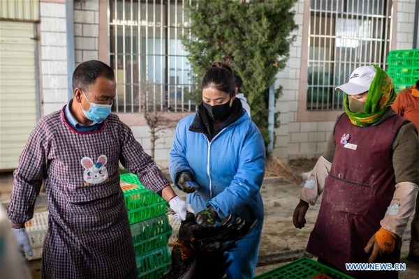 Staff members weigh the poultry raised by villager Li Yinzhen (L) at the Shangri-la e-commerce service center in Shangri-la of Diqing Tibetan Autonomous Prefecture, southwest China's Yunnan Province, March 17, 2020. Since the outbreak of COVID-19, local authorities in the poverty-stricken Diqing has taken great measures to ensure the safety of workers returning to work, including scanning OR codes for better health checks and disinfection at public areas. Up till now, Diqing has resumed production at a comprehensive level. (Xinhua/Hu Chao)