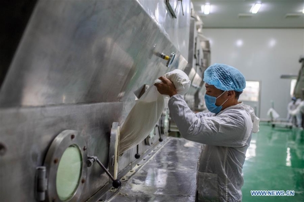 A worker works at the workshop of a dairy company in Shangri-la of Diqing Tibetan Autonomous Prefecture, southwest China's Yunnan Province, March 16, 2020. Since the outbreak of COVID-19, local authorities in the poverty-stricken Diqing has taken great measures to ensure the safety of workers returning to work, including scanning OR codes for better health checks and disinfection at public areas. Up till now, Diqing has resumed production at a comprehensive level. (Xinhua/Hu Chao)