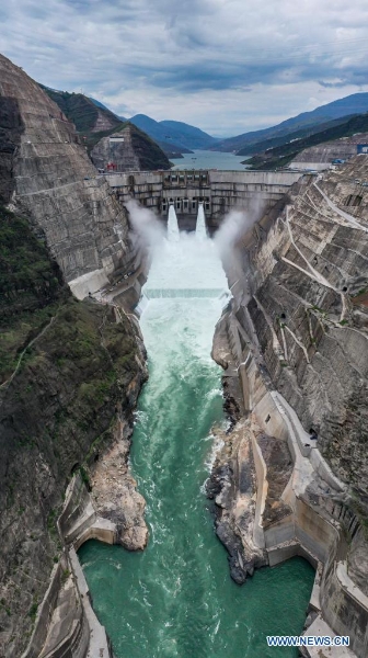 Photo taken on June 28, 2021 shows Baihetan hydropower station in southwest China. Baihetan hydropower station, the world's second largest in terms of total installed capacity, was officially put into use in southwest China, with two generating units in operation on Monday. (Xinhua/Jiang Wenyao)