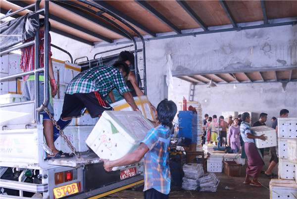 Employees unload frozen aquatic products from Myanmar at a trading center in Wanding, Yunnan province. [Photo/Xinhua]