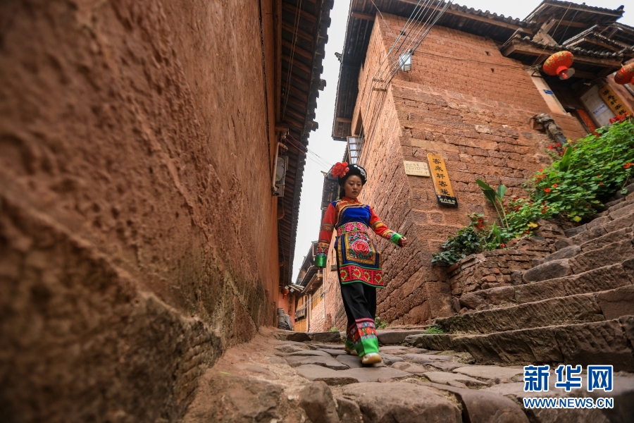Tourists wearing ethnic costumes walk on the stone road in Nuodeng ancient village. [Photo/Li Hao]