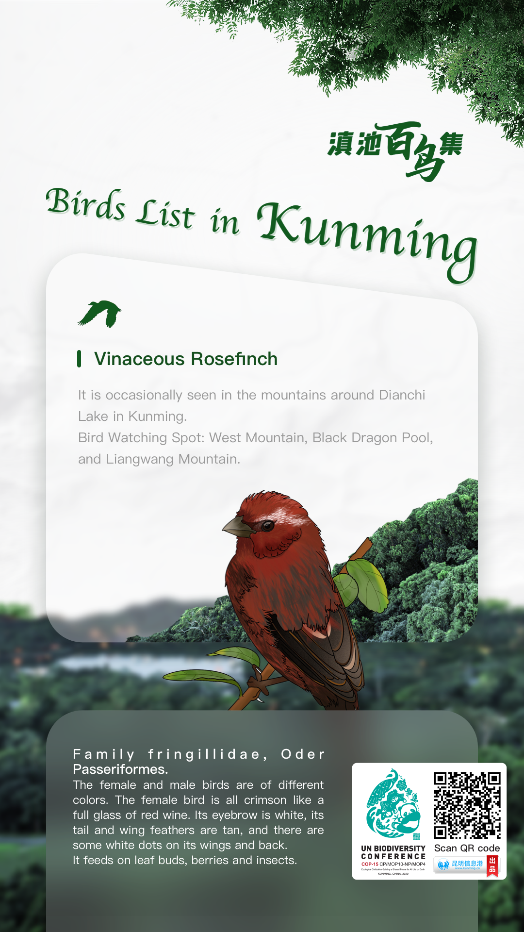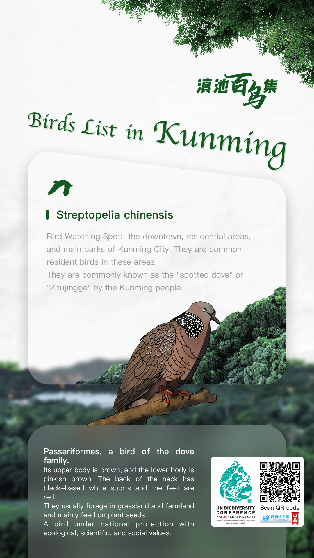 The second phase of the Fifteenth meeting of the Conference of the Parties (COP 15) to the UN Convention on Biological Diversity (CBD) started in Montreal, Canada, on December 7. In order to show the beauty of Kunming's ecology to the world, the English version of "Birds List in Kunming" popular science painted posters will be published on all the channels of the Kunming Information Hub.