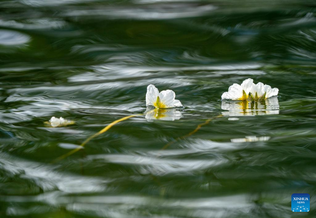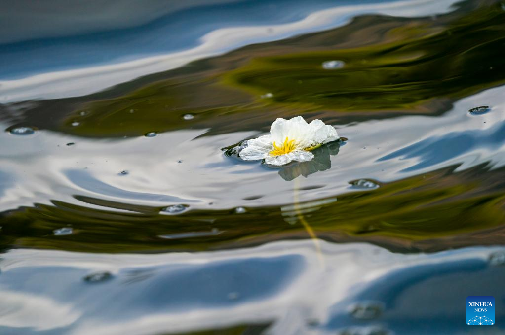 This photo taken on March 21, 2023 shows a view of the blooming ottelia acuminata in Dianchi Lake in Kunming, southwest China's Yunnan Province. Ottelia acuminata, as an indicator species of the environment, exists in fresh water. (Xinhua/Chen Xinbo)