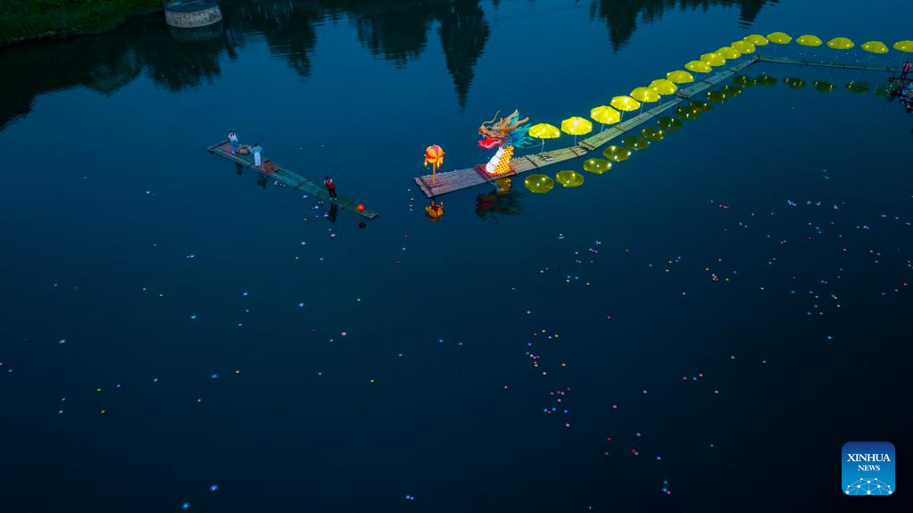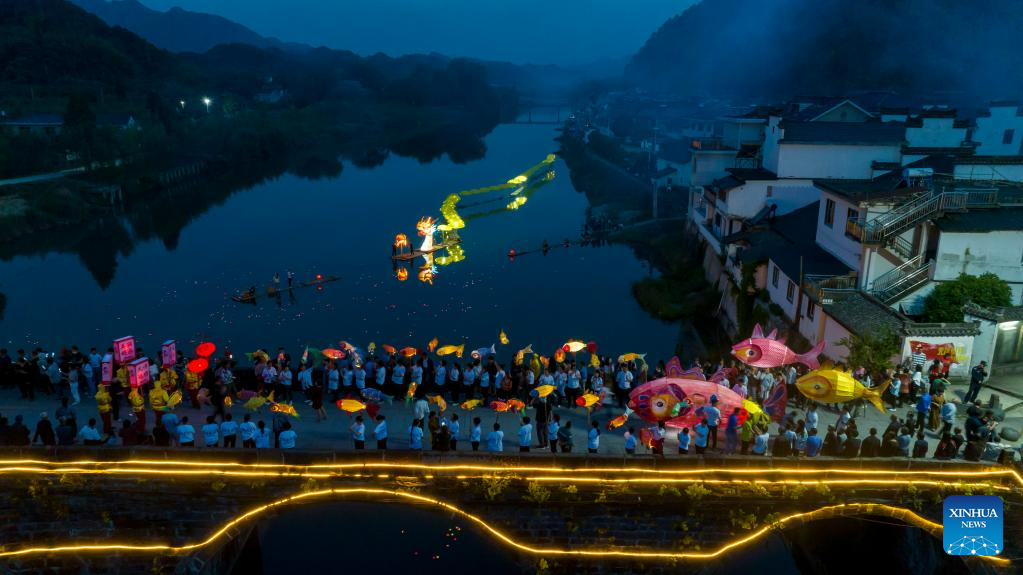 This aerial photo taken on June 16, 2023 shows a lantern performance in Hule Town of Ningguo City, east China's Anhui Province. Hule Town, an ancient town in east China's Anhui Province, has a tradition of lantern performance to celebrate festivals.