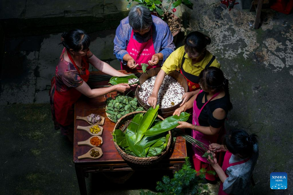 Villagers make Zongzi, a pyramid-shaped glutinous rice dumpling wrapped in bamboo or reed leaves, as the Dragon Boat Festival approaches in Hule Town of Ningguo City, east China's Anhui Province, June 17, 2023. Hule Town, an ancient town in east China's Anhui Province, has a tradition of lantern performance to celebrate festivals.
