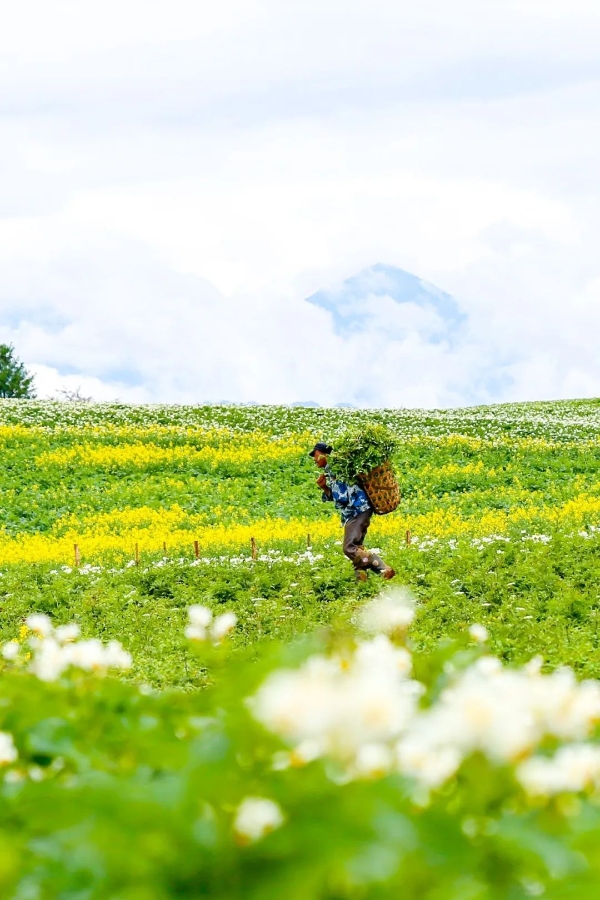 In the Tai'an Township of Lijiang's Yulong County, the hillsides are blanketed in a sea of white and purple potato blossoms. Walking amidst this dreamlike expanse, it feels like one has stepped into a fantastical world, with the flowers dotting the green foliage like stars scattered across the sky. As the gentle breeze the petals, a sense of enchantment permeates the air.