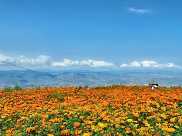 The vibrant, almost glowing orange hues of the marigolds in Baoshan City, Wuding County and Yuanmou County create a captivating landscape that blends seamlessly with the azure sky and fluffy white clouds, resembling a vast orange ocean.
