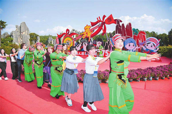 Youths from International Friendship Cities experienced Yunnan folk songs and dances in the Shilin Scenic Area.