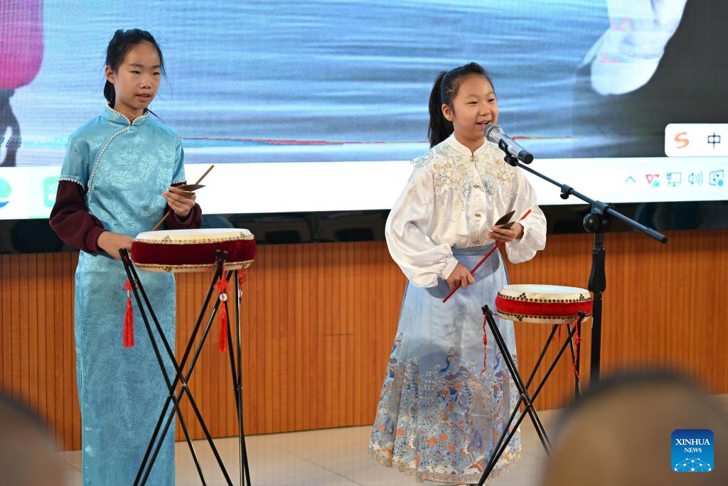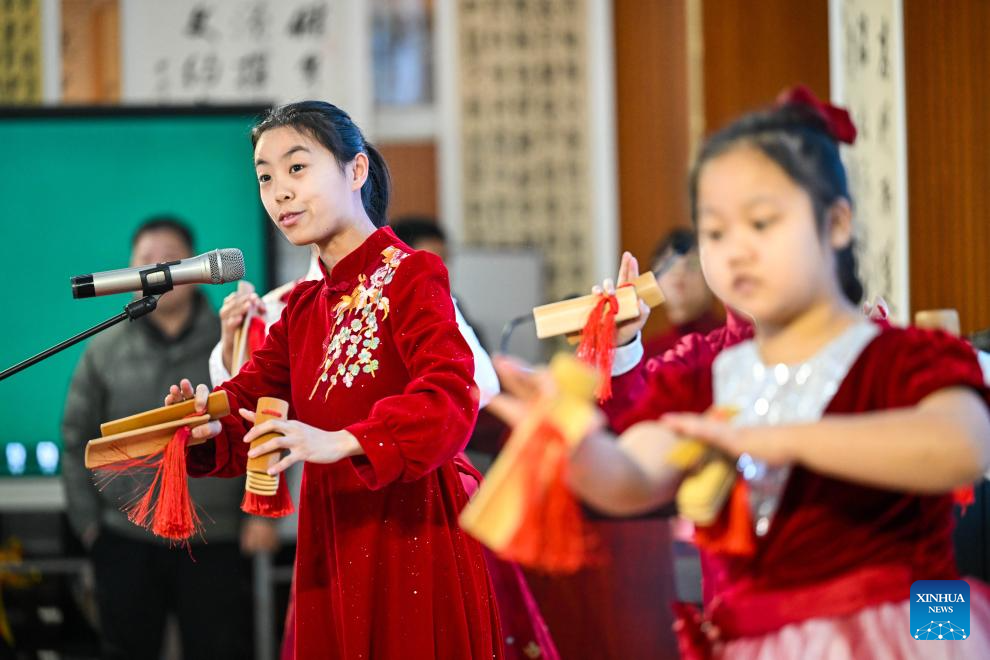 Students perform kuaiban, a traditional Chinese performance art that combines rhythmic clapping with storytelling, at the Yangcun No. 14 Primary School in Wuqing District of Tianjin, north China, Jan. 6, 2026. In recent years, this school has offered a series of classes and activities featuring traditional culture for students to experience. (Xinhua/Zhao Zishuo)