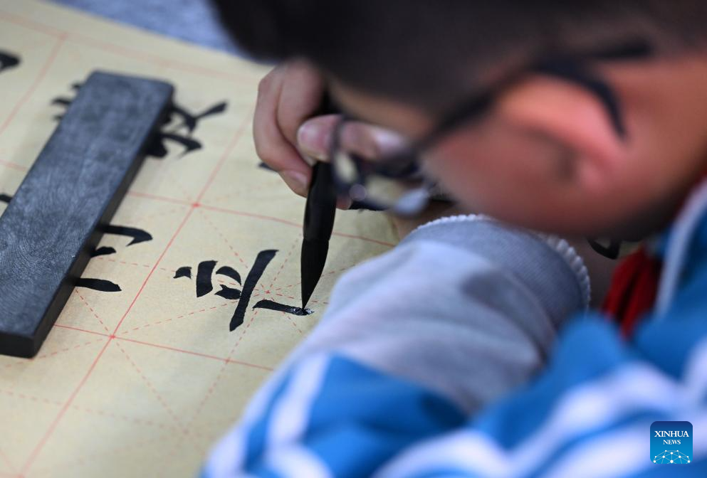 A student writes calligraphy at the Yangcun No. 14 Primary School in Wuqing District of Tianjin, north China, Jan. 6, 2026. In recent years, this school has offered a series of classes and activities featuring traditional culture for students to experience. (Xinhua/Zhao Zishuo)