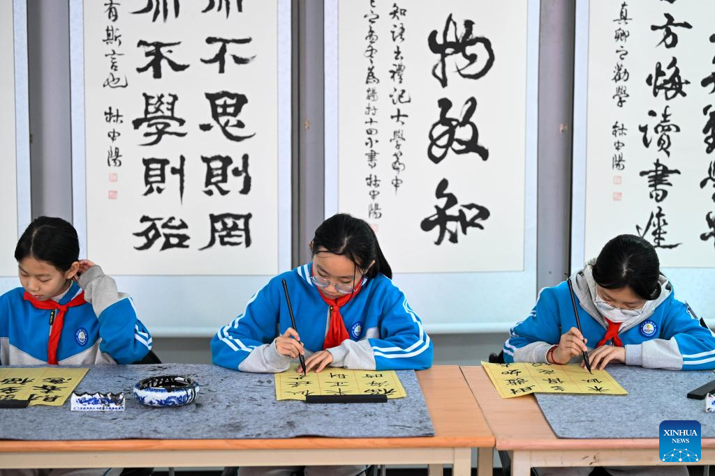Students write calligraphy at the Yangcun No. 14 Primary School in Wuqing District of Tianjin, north China, Jan. 6, 2026. In recent years, this school has offered a series of classes and activities featuring traditional culture for students to experience. (Xinhua/Zhao Zishuo)