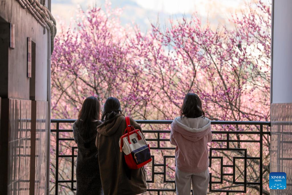 People enjoy plum blossoms at Jishou University in Xiangxi Tujia and Miao Autonomous Prefecture, central China's Hunan Province, Jan. 15, 2026. (Photo by Peng Biao/Xinhua)