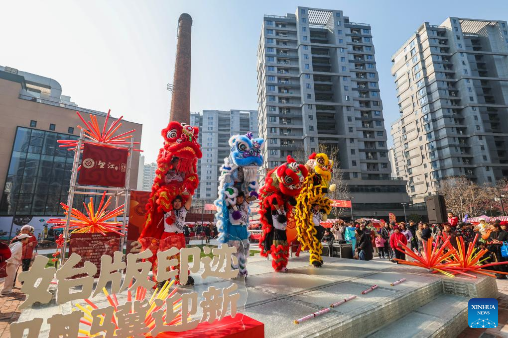 This photo taken on Jan. 24, 2026 shows a lion dance performance during a fair featuring intangible cultural heritage and Chinese New Year goods in Hangzhou, east China's Zhejiang Province. Kicking off in Hangzhou on Saturday, the event blends traditional festivities with modern trends, offering visitors an immersive experience of cultural crafts, holiday shopping, and folk performances. (Xinhua/Xu Yu)