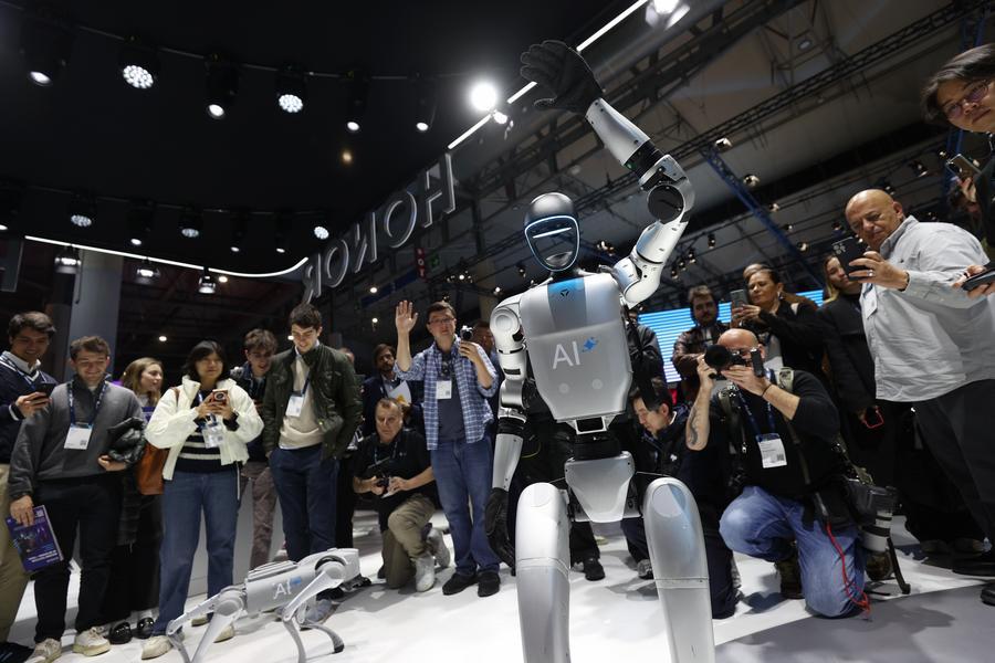 People watch the demonstration of a humanoid robot and a robotic dog at the booth of Honor at the 2025 Mobile World Congress in Barcelona, Spain, March 3, 2025. (Xinhua/Zhao Dingzhe)