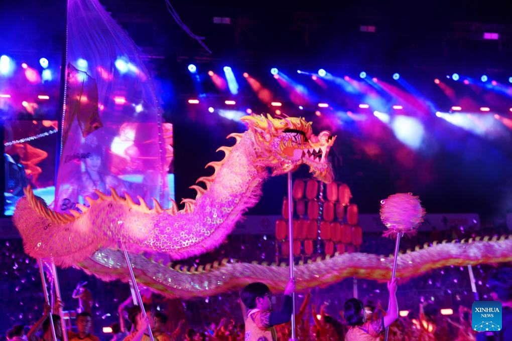 Performers perform dragon dance during the Chingay Parade as part of the Lunar New Year celebrations in Singapore on Feb. 27, 2026. (Photo by Then Chih Wey/Xinhua)