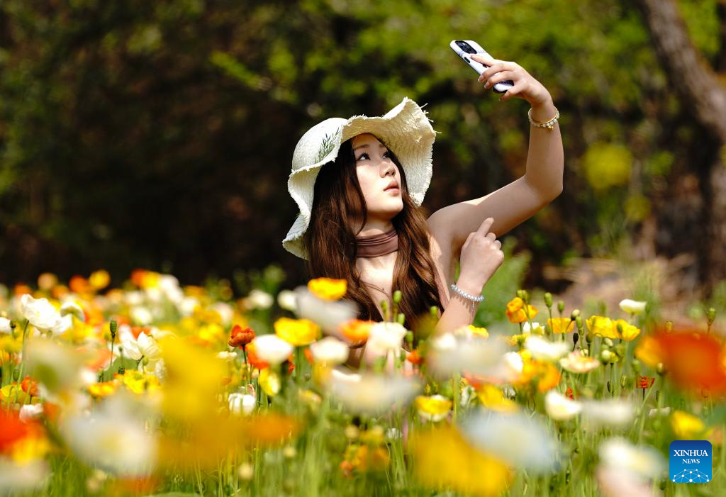 A visitor takes selfies with flowers at a scenic area in Kunming, southwest China's Yunnan Province, March 10, 2026. (Xinhua/Chen Xinbo)