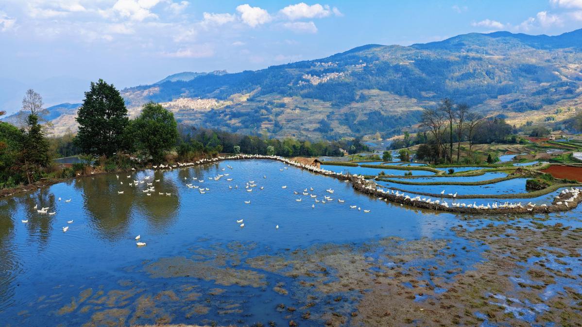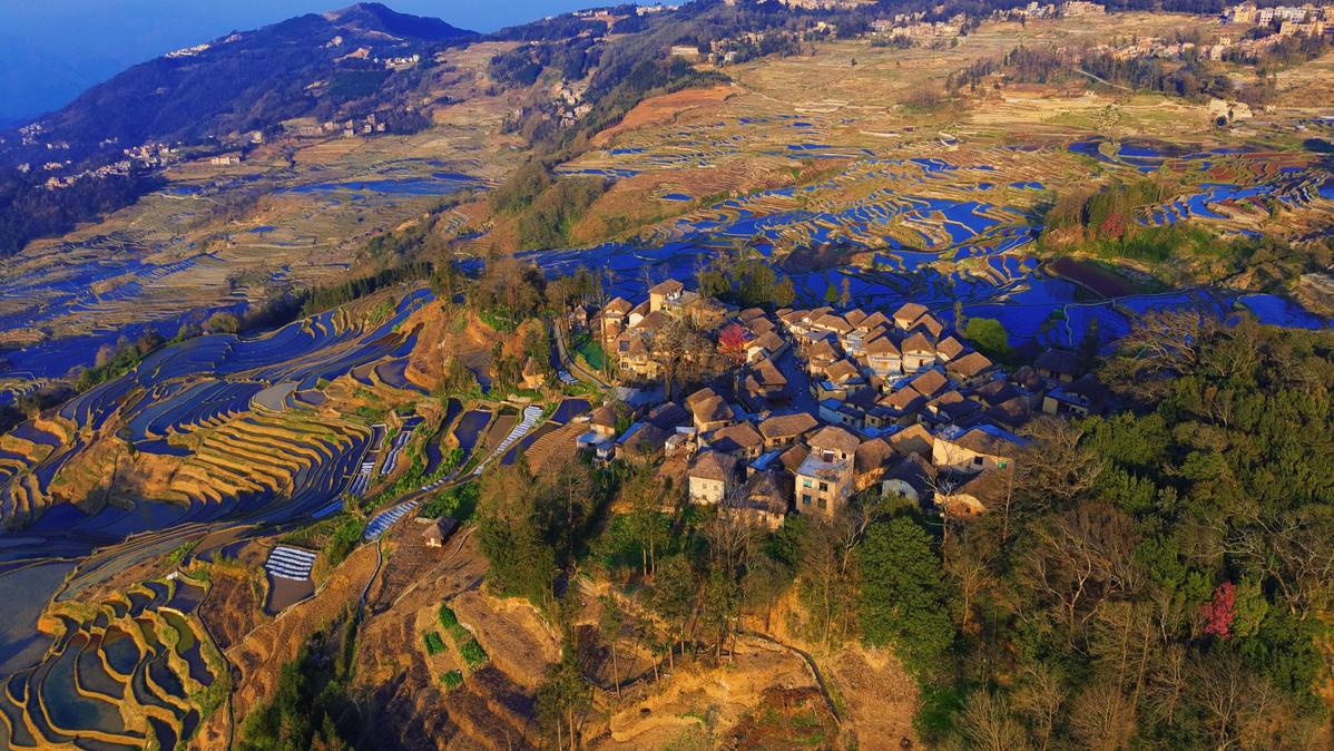 With the arrival of warmer weather, the Honghe Hani Rice Terraces in Yuanyang county, Yunnan province, offer a breathtaking view, where water-filled terraces seamlessly merge with vibrant spring blossoms.