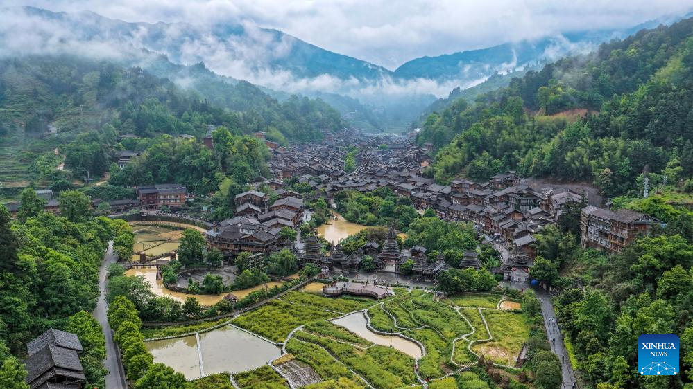 An aerial drone photo taken on April 20, 2026 shows a view of Zhaoxing Dong Village of Liping County, southwest China's Guizhou Province.
