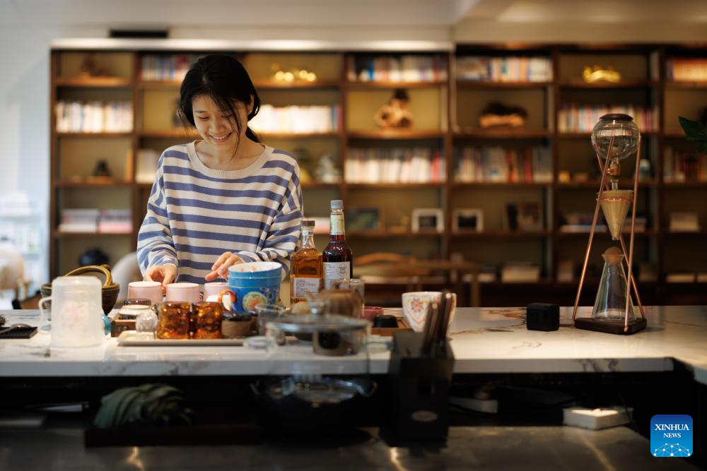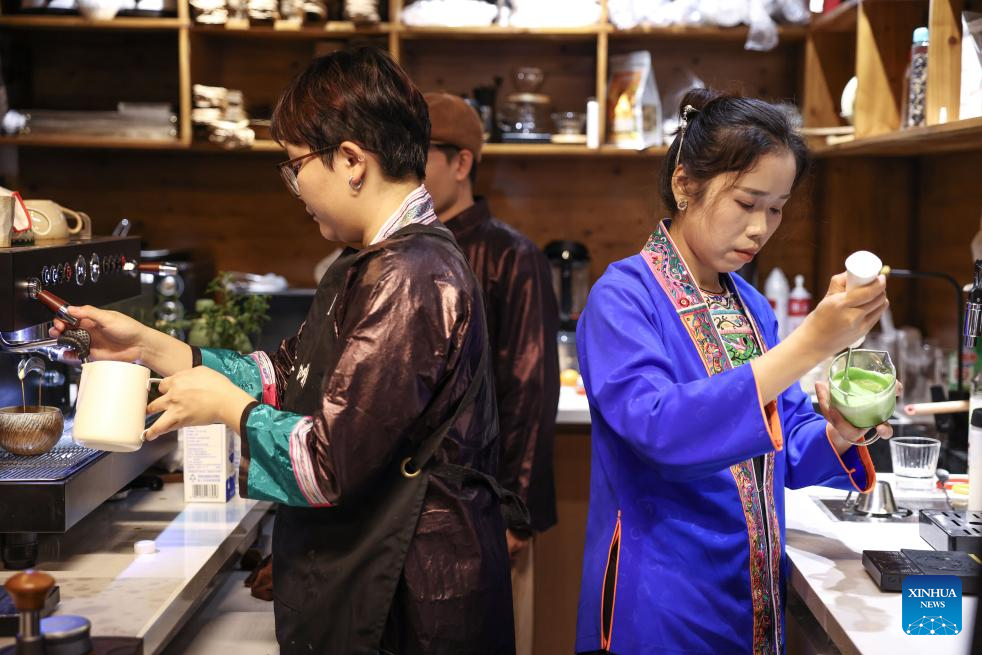 A villager (R) makes beverage at a cafe in Zhaoxing Dong Village of Liping County, southwest China's Guizhou Province, April 20, 2026.