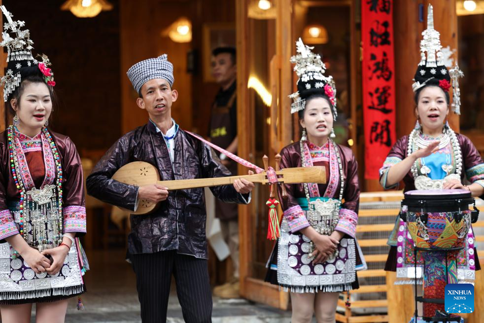 Staff members of a restaurant perform for tourists in Zhaoxing Dong Village of Liping County, southwest China's Guizhou Province, April 20, 2026.