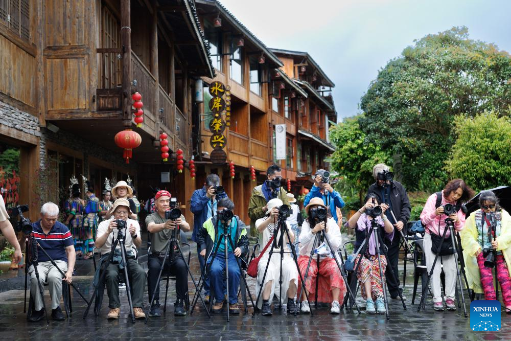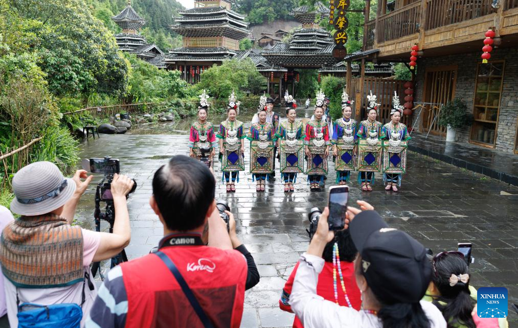 A group of tourists from Guangzhou take photos in Zhaoxing Dong Village of Liping County, southwest China's Guizhou Province, April 20, 2026.