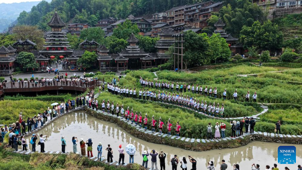Local residents welcome guests in Zhaoxing Dong Village of Liping County, southwest China's Guizhou Province, March 23, 2026.