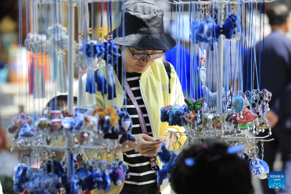 A tourist buys cultural creative products in Zhaoxing Dong Village of Liping County, southwest China's Guizhou Province, April 18, 2026.