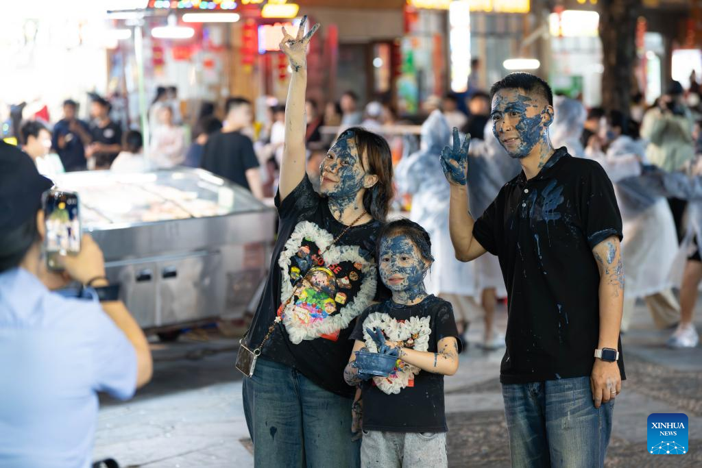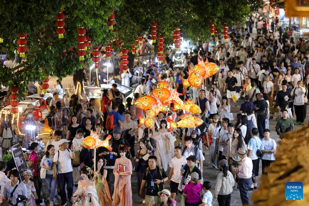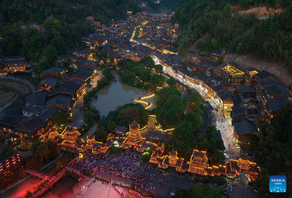 Tourists enjoy a lantern parade in Zhaoxing Dong Village of Liping County, southwest China's Guizhou Province, April 18, 2026.