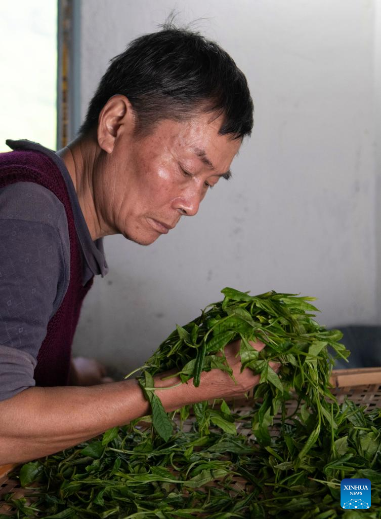 A tea farmer checks the newly-picked tea leaves in Houkeng Village, Huangshan District of Huangshan City, east China's Anhui Province, April 25, 2026. Taiping Houkui is a renowned green tea from Anhui, known for its flat, elongated leaves. It offers a unique aroma, mellow taste, and sweet aftertaste. Recently, the core production area of Taiping Houkui, the high-mountain tea gardens in Houkeng Village of Huangshan City, have entered the busiest harvest season.