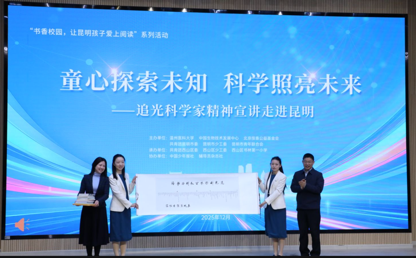 12月9日,由温州医科大学、中国生物技术发展中心、北京侒泰公益基金会、共青团昆明市委、昆明市少工委、昆明市青年联合会主办,共青团西山区委、西山区少工委、西山区书林第一小学承办,中国少年报社、辅导员杂志社协办的“童心探索未知 科学照亮未来——追光科学家精神宣讲走进昆明”活动成功举办,全市近200名师生代表参与本次活动。