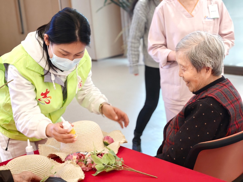 随后的“春日花帽”手工活动中,志愿者和长者化身“春日创作家”。志愿者耐心指导老人挑选干花、搭配色彩,将素净的草帽化作春日画布,一顶顶缀满故事的花帽在指尖诞生。一位奶奶轻抚帽檐感慨:“这帽子比花美,因为装着你们的心。”看着亲手完成的作品,老人们脸上露出了纯真的笑容,成就感满满,现场氛围温暖欢乐。