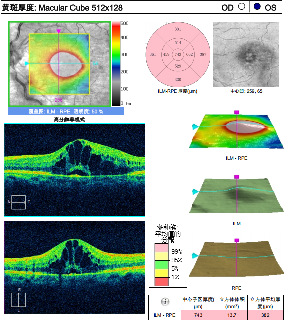 高阿姨OCT检查显示其视网膜中央性静脉阻塞(CRVO)继发黄斑囊样水肿