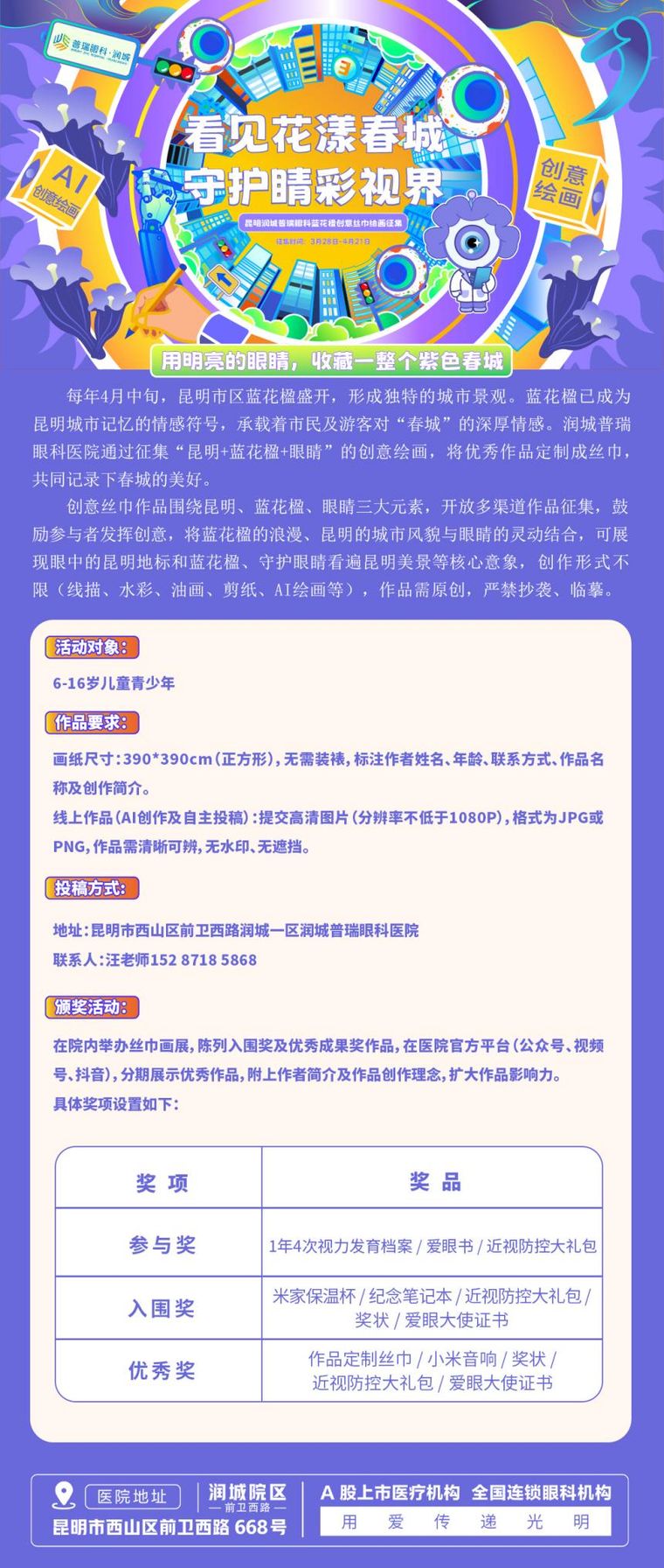 所有参赛作品将由昆明润城普瑞眼科医院收藏,主办方拥有作品的展览、宣传及衍生品制作(如丝巾定制)等使用权,作者享有署名权。作品将作为公益载体,用于传播眼健康事业。