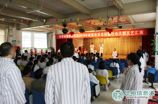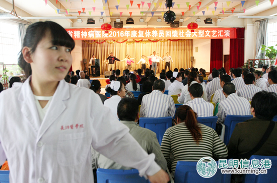 昆明信息港讯 记者合宇聪 4月28日下午2点,“云南省精神病医院2016年康复休养员回馈社会大型文艺汇报演出”如期举行,在医护人员、志愿者、家属的眼泪中,酒依赖患者、儿少科患者、中西医科患者和医护人员一同把最质朴的演出奉献给了大家。在云南省精神病医院康复中心,这里的音乐治疗、艺术治疗,将成为每一个精神病患者回归家庭、回归社会缓冲地带。在这里他们缺失的社会功能、社交功能将一一重建,继而回归社会。