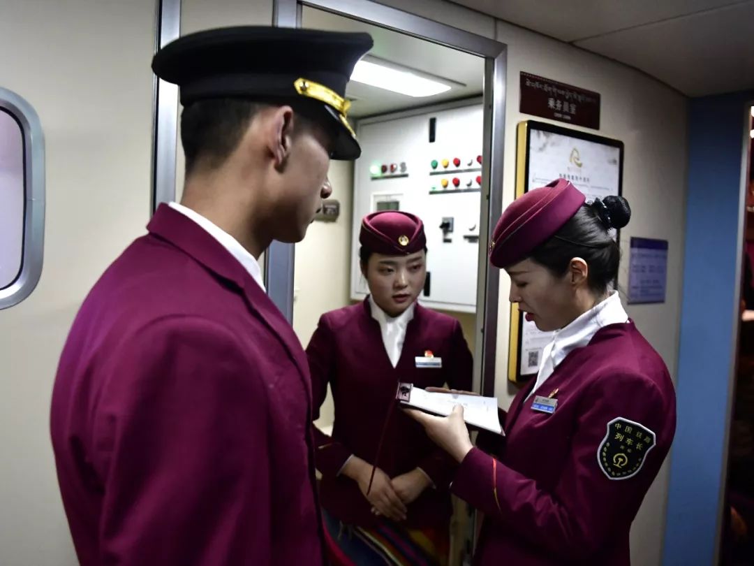 1月21日,贡久曲珍(右)在向车厢乘务员询问重点旅客状况。