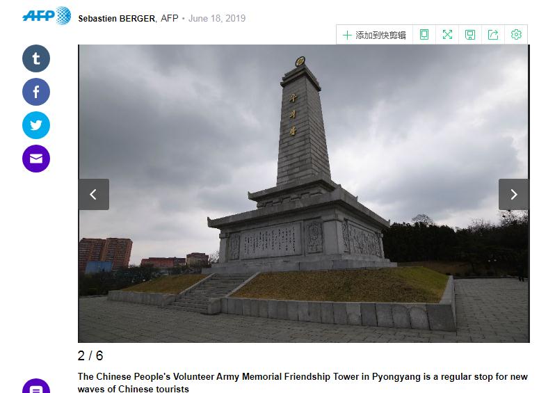 “中朝友谊塔”是中国游客入访朝鲜的必游之地。图片来源:法新社报道截图