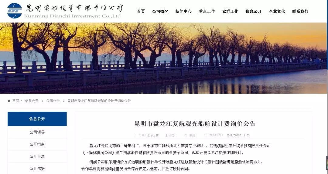 近日,昆明滇池投资有限公司官网发布《昆明市盘龙江复航观光船舶设计费询价公告》,昆明滇投的全资子公司——滇润生态环境科技有限责任公司拟采用询价方式选聘船舶设计单位,开展盘龙江适航船舶设计。