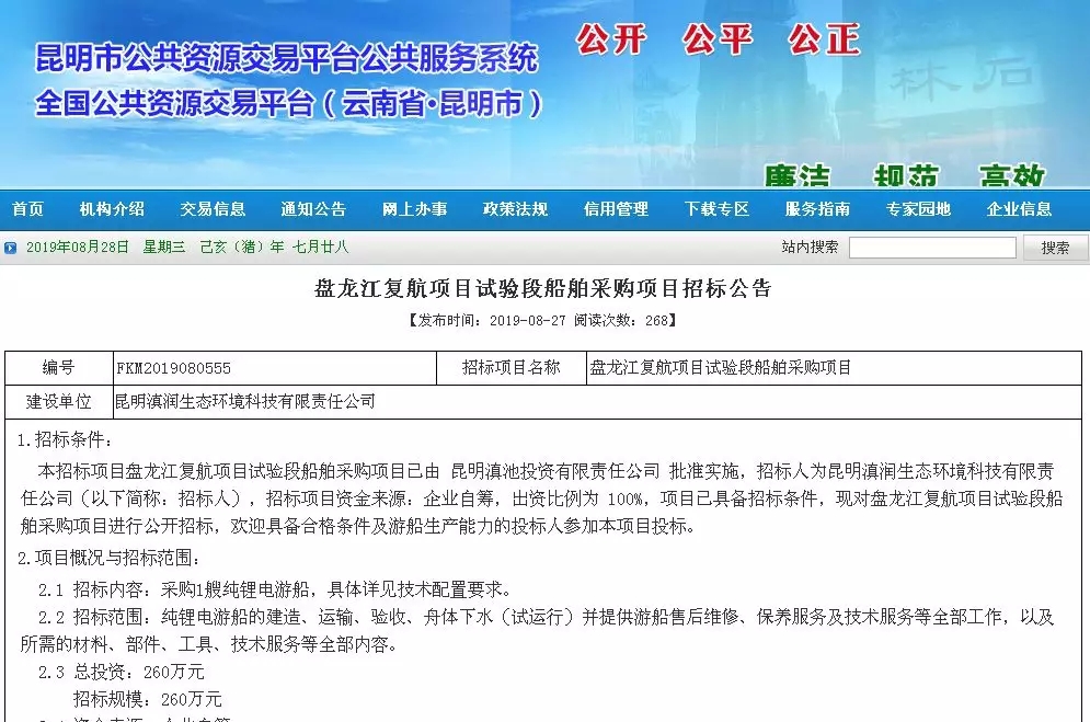 8月27日,昆明市公共资源交易平台网发布《盘龙江复航项目试验段船舶采购项目招标公告》。公告显示,盘龙江复航项目试验段船舶采购项目已由昆明滇池投资有限责任公司批准实施,招标人为昆明滇润生态环境科技有限责任公司。现对盘龙江复航项目试验段船舶采购项目进行公开招标,招标内容是将采购1艘纯锂电游船。这意味着,盘龙江复航的计划又往前推进了一步。