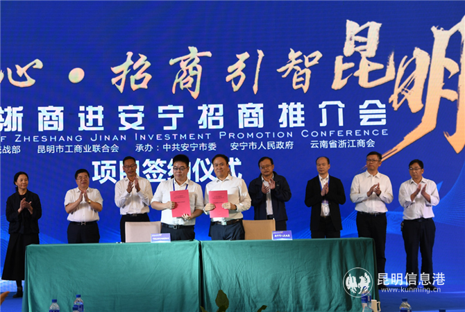 会上,安宁市政府有关领导与云南省浙江商会会长张金炉签订了《招商引资战略合作协议书》。现场还签约了中国光大环保能源有限公司市政设施项目、安宁职教祁家庄康养项目、安宁玫瑰庄园及玫瑰花发酵项目、云品出滇安宁禄脿冷链物流、浙商产业园区、现代物流园区、跨境贸易供应链平台、浙江开达管业安宁基地项目、PI装配式建筑生产基地协议书。当天共签约10个项目,意向投资额94亿元。