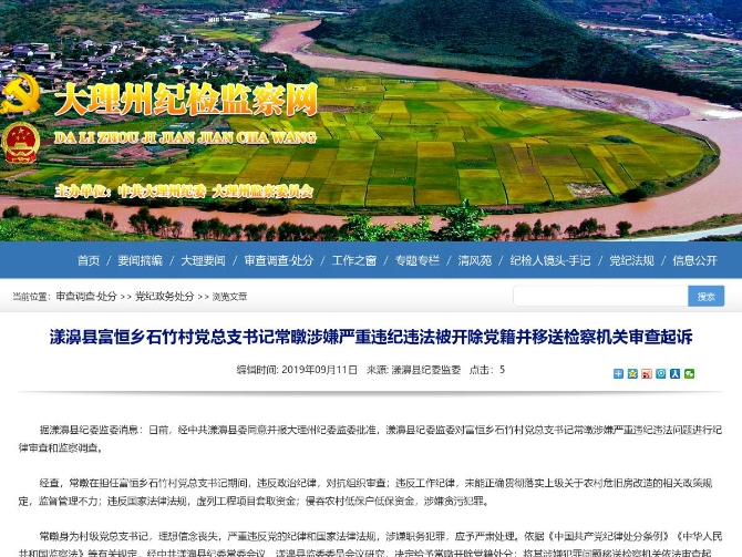 漾濞县富恒乡石竹村党总支书记常暾涉嫌严重违纪违法被开除党籍