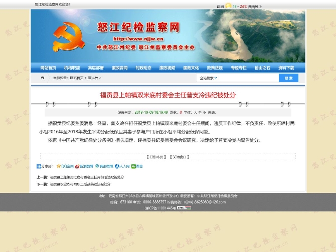 福贡县上帕镇双米底村委会主任普支冷违纪被处分