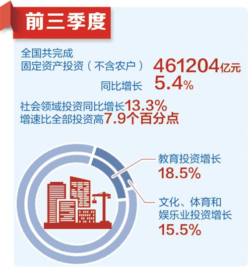 前三季度,社会领域投资同比增长13.3%,增速比全部投资高7.9个百分点。其中,教育投资增长18.5%,文化、体育和娱乐业投资增长15.5%。